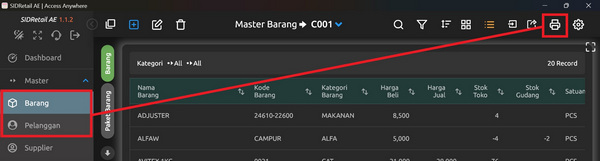 klik menu master > klik master barang > klik ikon, seperti printer gambar di bawah ini