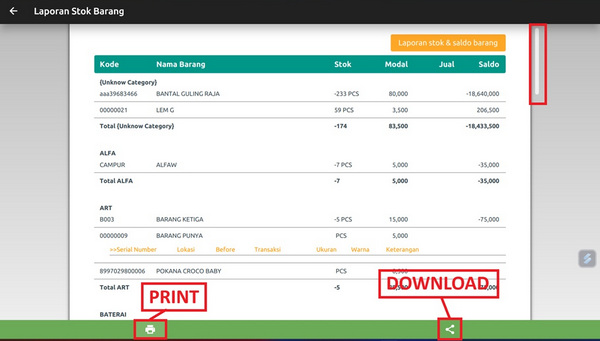 klik ikon printer pada bagian kiri bawah untuk mencetak laporan stok barang dan klik ikon share pada bagian kanan bawah untuk mendownload soft file laporan stok barang, seperti gambar di atas