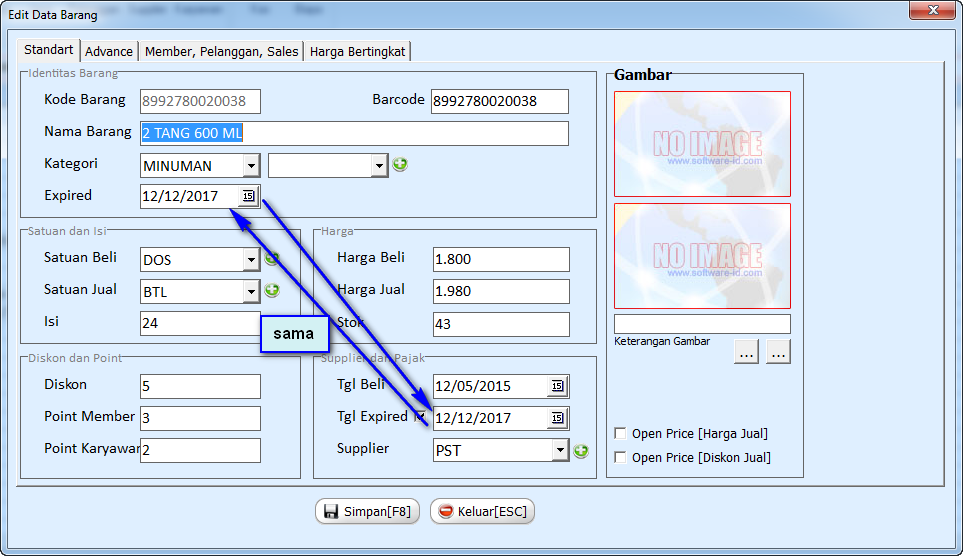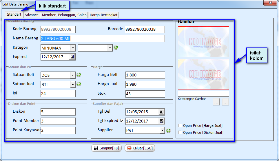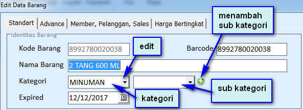 Sebelum melakukan transaksi pada software minimarket sid retail pro tentunya harus dilakukan penginputan data yang akan dikelola dalam aplikasi. Terdapat berbagai macam penginputan data pada aplikasi software retail pro. Salah satunya yaitu input data barang. Input data barang dapat dilakukan dengan cara edit atau tambah data barang pada menu master. Input data barang tersebut terbagi menjadi empat bagian yang terdiri atas (1) standart, (2) advance, (3) member, pelanggan dan sales, (4) harga bertinggat. Karena penginputan barang merupakan hal yang harus dilakukan dan bersifat wajb. Maka cara penginputan data barang akan dijelaskan satu per satu. Yang pertama yaitu mengenai cara input barang pada software retail pro bagian standart.