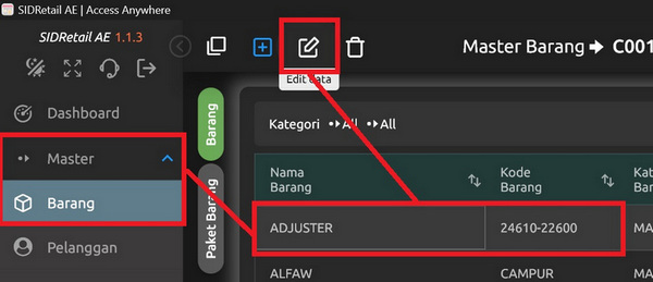 klik menu master > klik master barang > pilih barang yang akan disetting bisa ubah harga jual saat di penjualan barang > klik ikon edit, seperti gambar di bawah ini