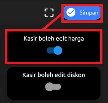 pada bagian kanan, aktivkan kasir boleh edit harga > klik simpan