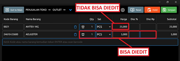 pada kolom harga barang yang sudah disetting sebelumnya, harga barang bisa diedit, sedangkan pada barang yang tidak disetting tidak bisa diubah harga jual barangnya, seperti gambar di atas.