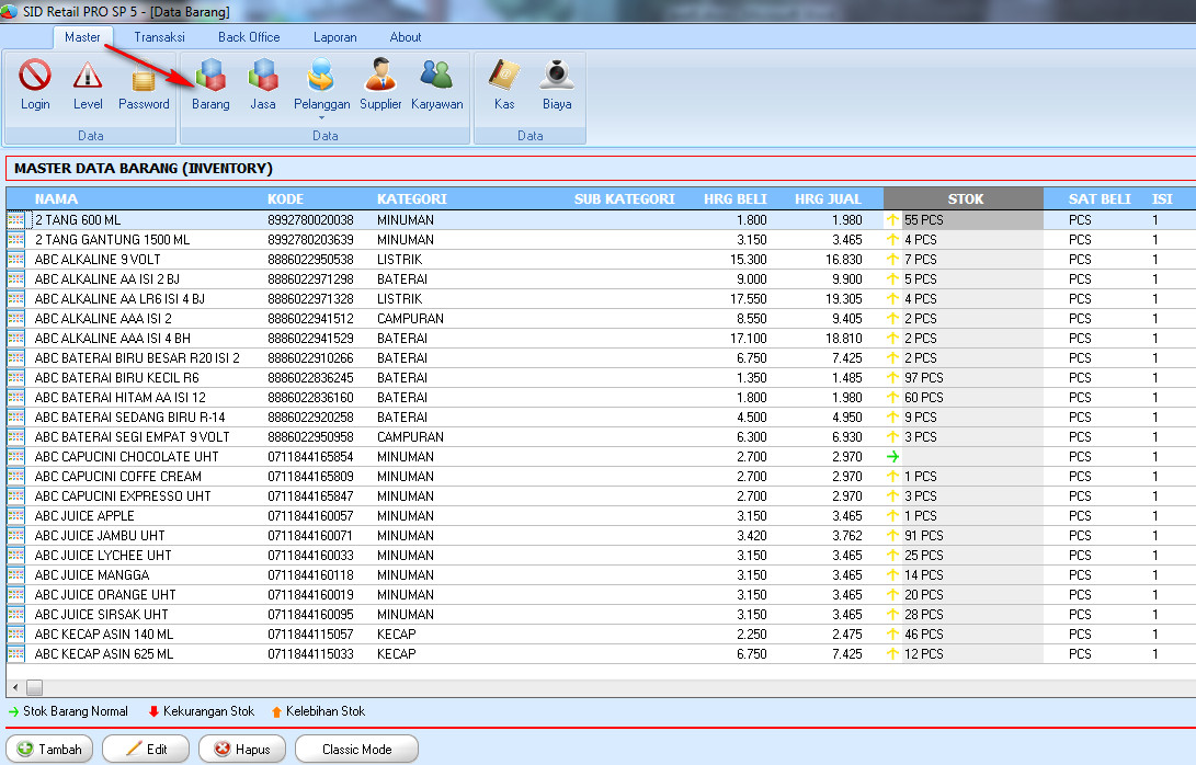 3.Masuk ke menu Master - Barang maka akan muncul tampilan master barang bawaan instalasi program. Seperti gambar berikut :