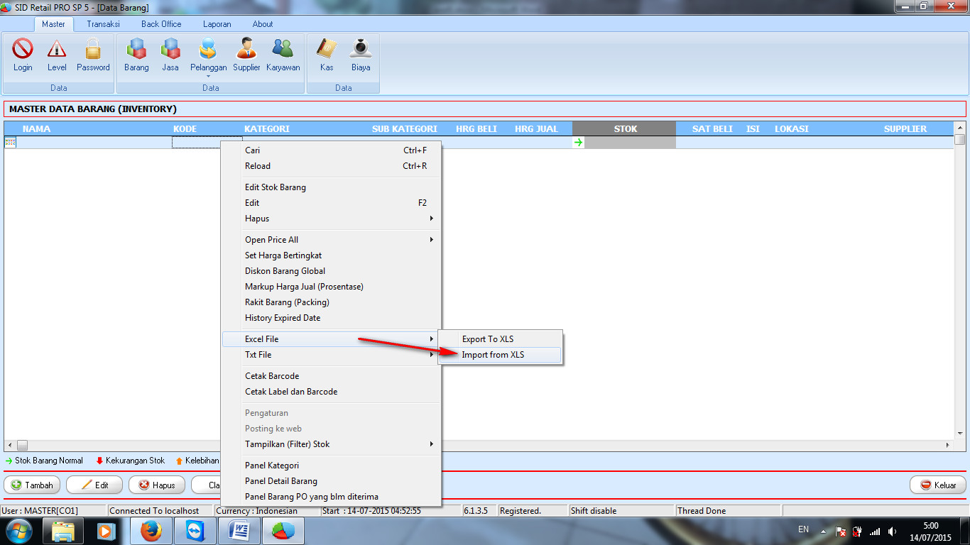 4.Lanjutkan dengan klik kanan pada Master Barang - Exel File - import from XLS . seperti gambar berikut :