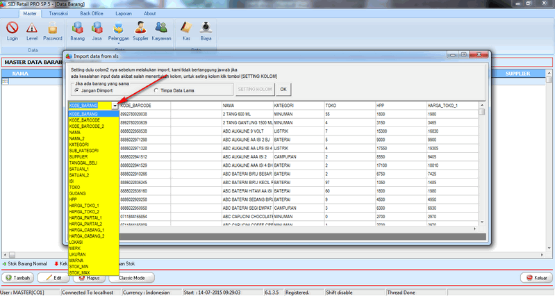 5.Selanjutnya pada tampilan Import Data From XLS Klik Setting Kolom sesuaikan nama nama kolom di master barang yang ada di file excel dengan database program, kode barang di set ke KODE_BARANG, kode barcode di set ke KODE_BARCODE, nama barang di set ke NAMA, harga beli di set ke HPP, harga jual di set ke HARGA_TOKO_1, supplier di set ke SUPPLIER, stok di set ke TOKO, setelah selesai di setting, Klik OK Seperti gambar berikut :