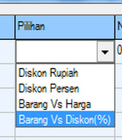 4. Barang Vs Diskon(%) > Merupakan tawaran hadiah kepada Pelanggan Anda berupa barang yang telah didiskon pada batas pembelian harga tertentu yang telah Anda buat di dalam menu "Jum 1" atau "Jum 2" jika Anda memakai pilihan "Antara" dalam menu "Operator". Contohnya Pelanggan Anda mencapai batas harga yang telah Anda tentukan seperti Rp200.000, maka pelanggan tersebut mendapat tawaran hadiah barang yang telah didiskon. (Jika Anda memilih pilihan Barang Vs Diskon (%) Anda akan diharuskan memilih barang yang akan Anda tawarkan kepada pelanggan dan isi besaran diskon barang yang akan Anda tawarkan tersebut).