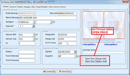 Pada bagian kanan bawah terdapat Pilih Open Price [Harga Jual] dan Open Price [Diskon Jual] apabila harga bisa diubah saat penjualan (harga jual bukan harga net), atau Jangan dicentangi Open Price apabila harga tidak bisa diubah saat transaksi penjualan.