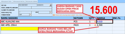 Pada saat penjualan di Kasir menu Open price normalnya pada saat penjualan, harga barang, diskon barang, diskon harga tidak bisa diubah. Ketika Anda mengaktifkan Open Price [Harga Jual] dan Open Price [Diskon Jual] menu ini akan bekerja harga barang pada saat penjualan akan bisa diedit harga barang, diskon barang, diskon harganya, biasanya saat penjualan warna fontnya berbeda dengan barang lainnnya (ketika menu Open Price tidak diaktifkan):