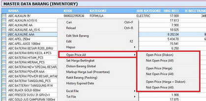 Jika anda Ingin membuat semua barang yang ada diprogram jadi open price ataupun tidak open price, tanpa harus meng edit satu - satu juga bisa dengan cara: klik kanan master barang - pilih Open Price All seperti gambar berikut: