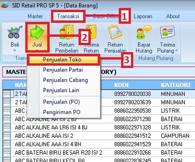 Kemudian beralih ke Form Penjualan untuk pengecekan aktiv atau tidaknya Menu Open Price dalam penggunaan SID Retail Pro / Software Minimarket, Klik Menu Transaksi > klik Jual > klik Penjualan Toko > klik Tambah (pada bagian kiri bawah)