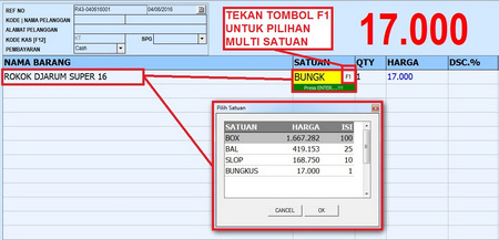 Penjualan Barang dengan Banyak Satuan (Contoh: Bungkus, Slop, Pak, Box) bisa digunakan pada Software Minimarket. Penjualan barang dengan sistem banyak satuan jual membantu Anda agar cepat dalam transaksi penjualan dengan menggunakan Software Minimarket, Anda tidak perlu lagi menginputkan banyak Satuan barang lagi dalam satu barang seperti Rokok dengan harga Rp1.632.000 dan kemudian diinputkan lagi barang dengan nama barang yang sama tetapi dalam satuan yang berbeda seperti Rokok 1 Slop Rp172.000. Tentu sungguh sangat tidak efektif dan efisien bukan?
