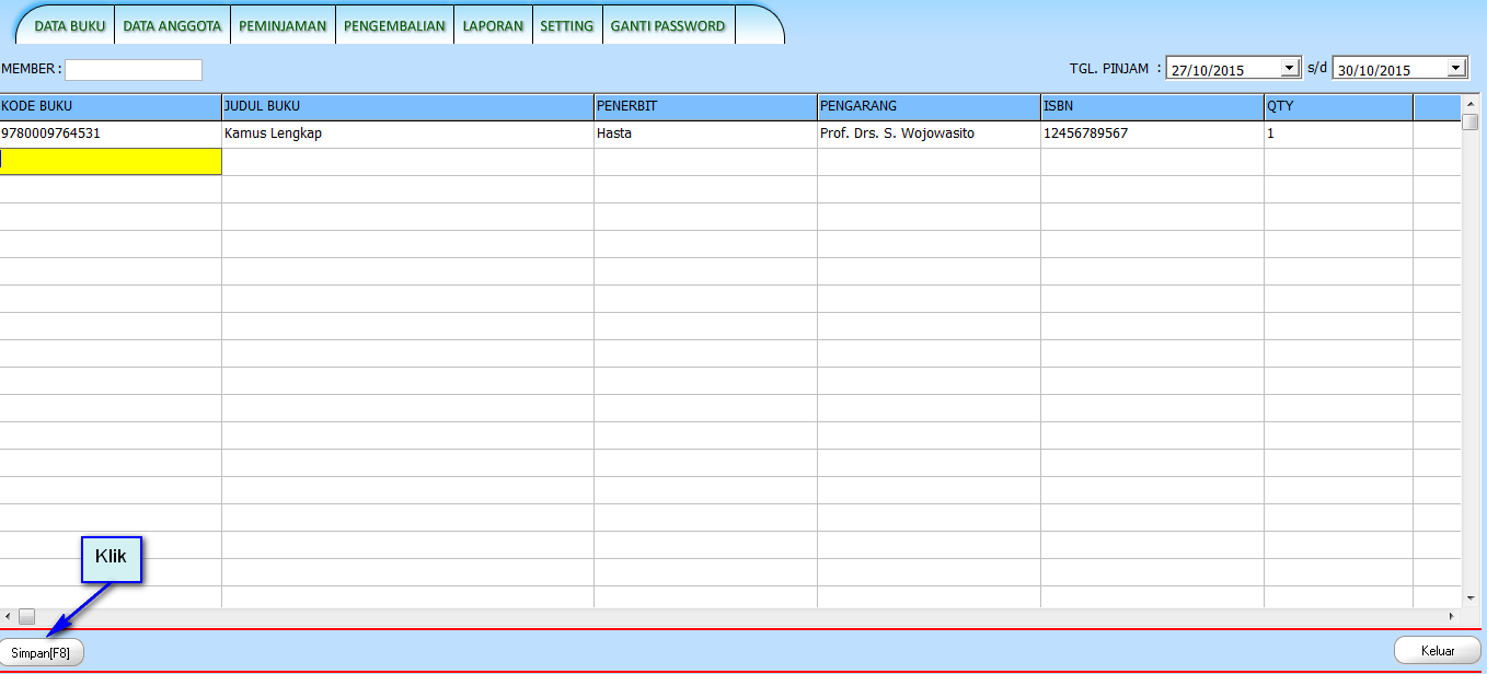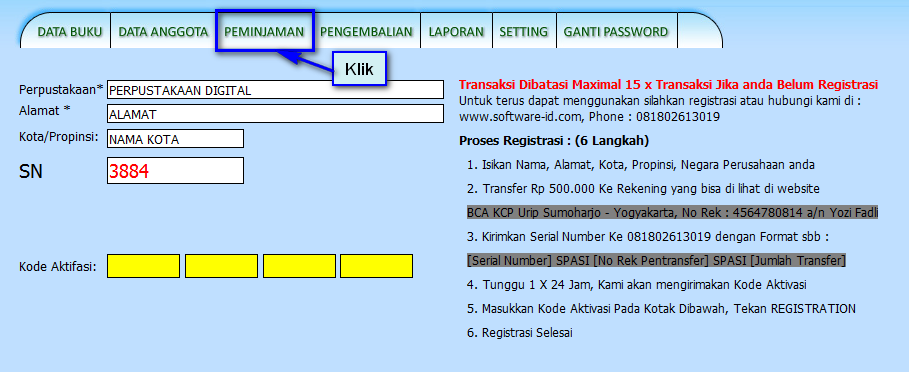 Inilah tutorial mengenai Cara Input Data Peminjaman Buku Pada Software Perpustakaan. Masih banyak tutorial-tutorial lainnya yang kami buat. Semoga menjadi referensi yang bermanfaat bagi para pembaca. Apabila ada komentar, kritik ataupun saran silahkan kirim via e-mail : admin@software-id.com atau phone 087858341109 / 082133038180 atas nama Yozi Fadli.