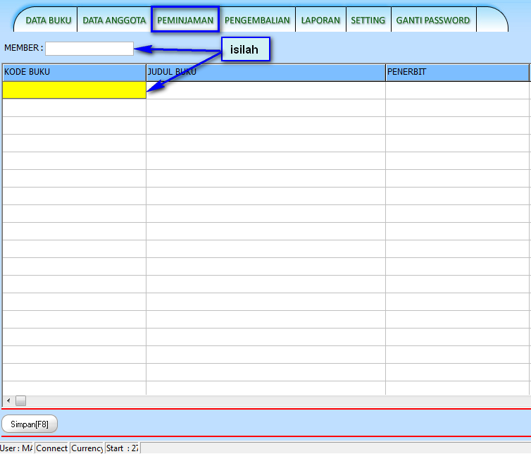 Dalam administrasi perpustakaan tentunya identitas anggota merupakan salah satu hal yang penting. Karena dari data tersebutlah dapat diidentifikasi apabila terdapat anggota yang meminjam buku. Peminjaman buku perlu dicatat untuk pertanggung jawaban peminjam buku dan data untuk perpustakaan itu sendiri. Jika terdapat peminjam buku dengan jumlah yang banyak tentunya akan membuat petugas perpustkaan atau administrator kesusahan dalam pendataan. Oleh karena itu, SID membuat suatu produk software perpustakaan yang berfungsi untuk membantu para administrator perpustakaan. Adapun cara input data peminjaman buku tersebut adalah sebagai berikut: